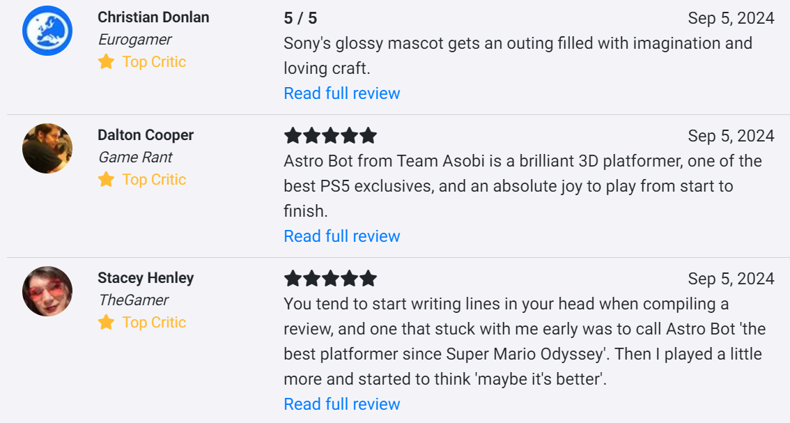 The game has also managed to break the PS4 and PS5 mold of third-person action-adventure tiles phenomenally. A game doesn’t have to be gritty and realistic with a deep story to have mass appeal on the console. Looking at user scores on the PlayStation store and Metacritic, its clear that the player base and critics are on the same page. With a universally positive 9.5 score, Astro Bot has immediately become a hit with pretty much everybody. Take a look at some of the critic reviews below: